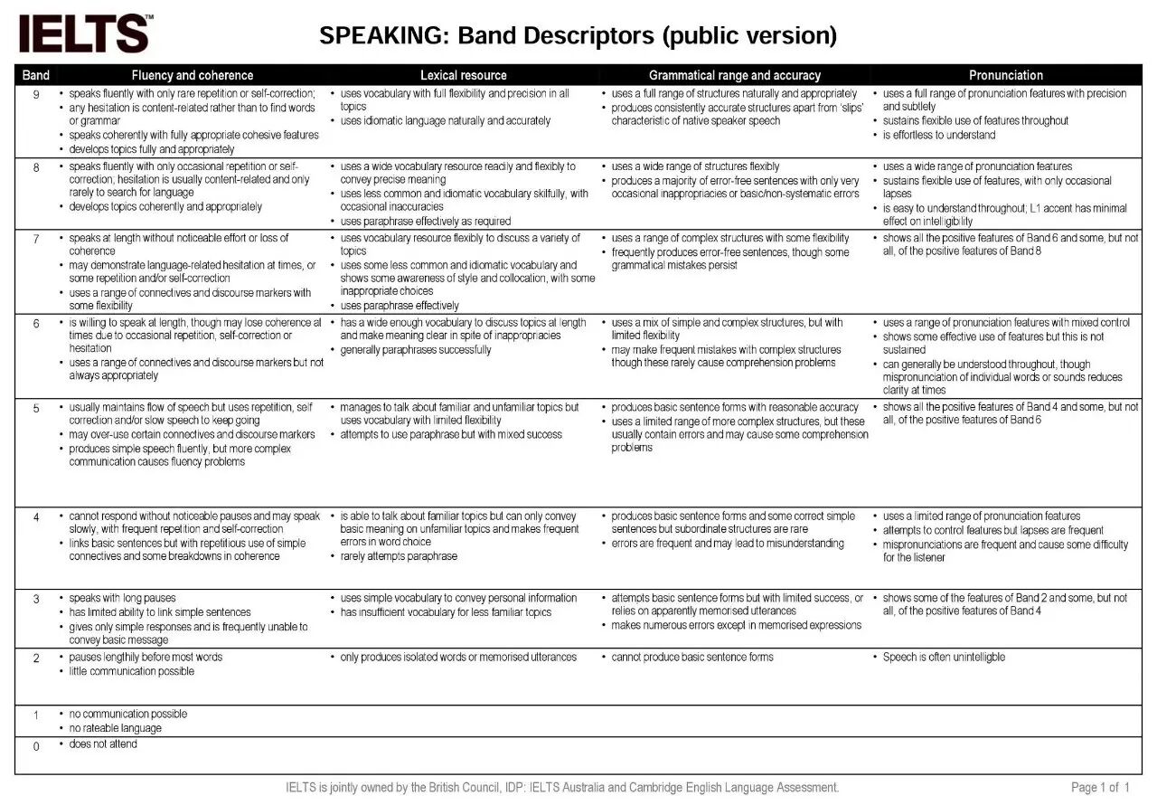 雅思官方:针对雅思口语1-9分各项分值的定义标准图。