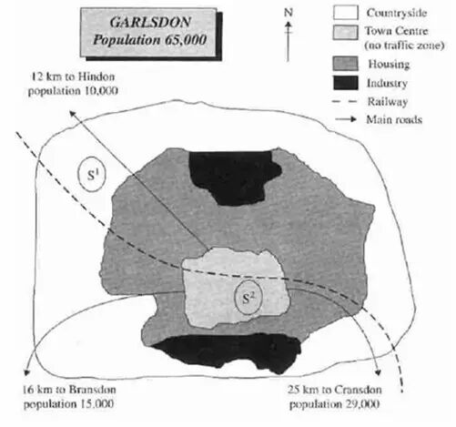 The map below is of the town of Garlsdon. A new supermarket (S) is planned for the town. The map shows two possible sites for the supermarket.