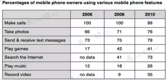 In 2006, all people used their phones to make calls. Moreover, 73% of people liked to send and receive text messages and 66% of mobile phone users took photos. However, nobody made use of the functions such as searching the Internet and recording videos.【细节段落一,重点描述了起始年份的信息】