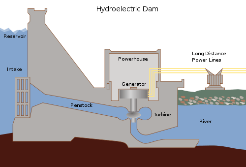 The diagram shows how electricity is generated by a hydroelectric dam.