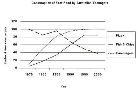 The line graph below shows changes in the amount and type of fast food consumed by Australian teenagers from 1975 to 2000.
