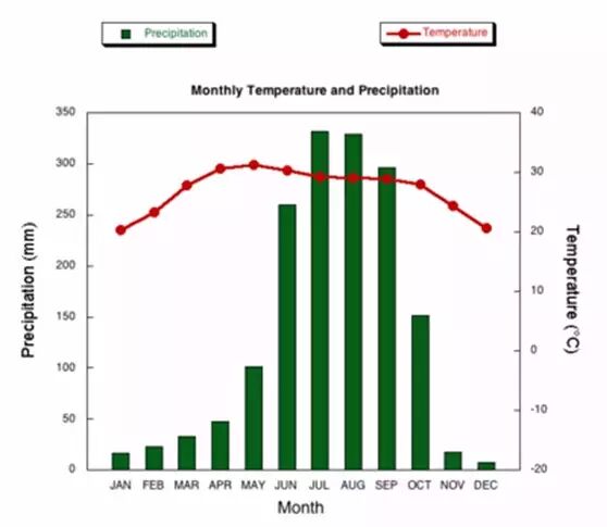 While temperatures stay roughly the same for the next four months, the amount of rainfall more than doubles between May and June. Figures for precipitation remain above 250mm from June to September, peaking at around 330mm in July. The final three months of the year see a dramatic fall in precipitation, to a low of about 10mm in December, and a steady drop in temperatures back to the January average.【后面几个月变化较大,重点描述】