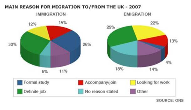 The pie charts show the main reasons for migration to and from the UK in 2007.