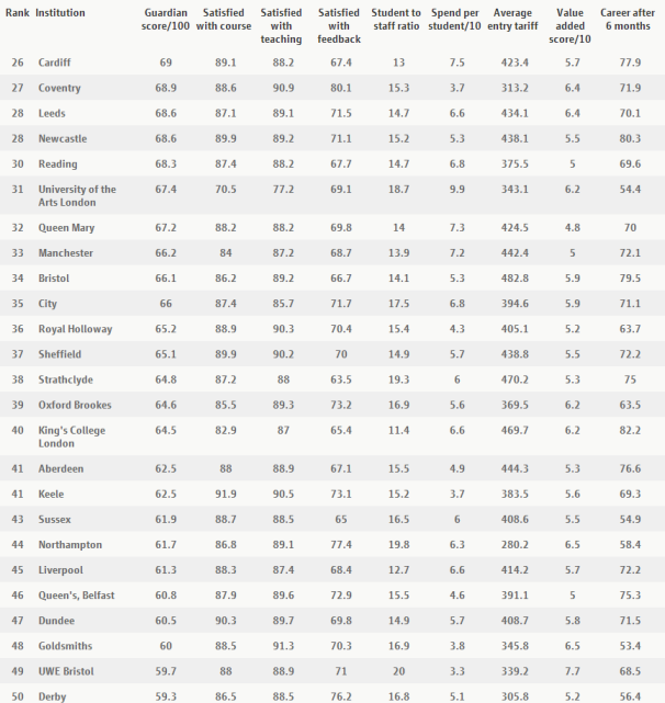2015卫报英国大学排名由权威媒体《卫报》编订,本排行榜是按照全国学生普查(National Student Survey,NSS)对即将毕业的本科生所作的调查的结果计分的,主要根据对学校毕业生的调查结果、就业前景以及师资力量计分统计。对于准备去英国留学的同学来说,2015卫报英国大学排名非常具有参考价值。