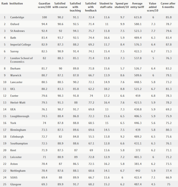 从排名中可以看到剑桥大学连续四年蝉联冠军,牛津大学依然很“二”,而意外的是,圣安德鲁斯大学成了今年的探花,巴斯大学升至第四,去年的老三伦敦政治经济学院却降到了第7。