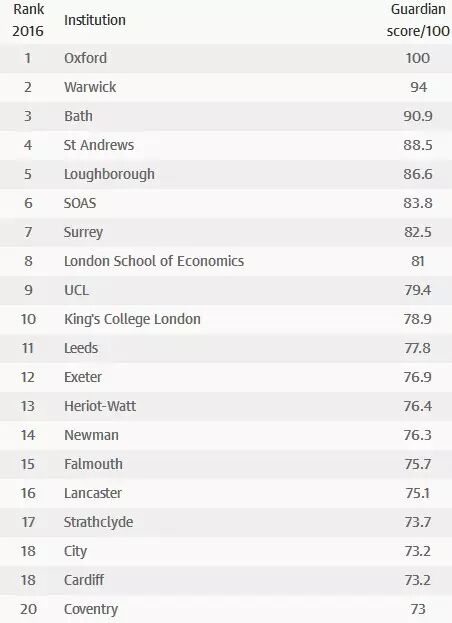 The Guardian 2016 英国大学排名