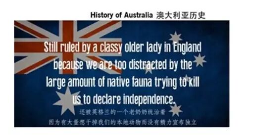 3.澳大利亚历史:还被英格兰的一个老奶奶统治着,因为有大量想干掉我们的本地动物而没有精力宣布独立。
