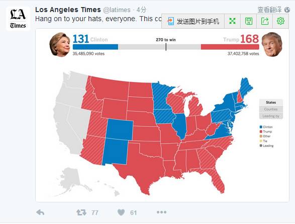中文翻译: 唐纳德·特朗普赢得美国大选,击败民主党候选人希拉里·克林顿当选第45任/58届美国总统。