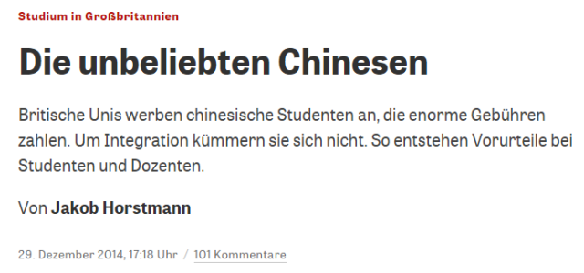 其实很早之前就想分享关于中国留学生的一些想法,刚好今天在知乎上看到一个提问“如何做一名优秀而得体的留学生?”,提问的朋友附带了一篇德国时报周刊(Zeit Online)的文章《Studium im Grobritannien: Die unbeliebten Chinesen》(在英国不受欢迎的中国留学生),问大家如何去做名优秀得体的留学生?
