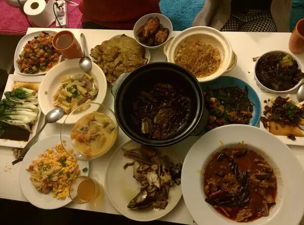 晚上嘛……一个半小时,14道菜,1个人做,4个人吃,╮(╯▽╰)╭最后水果点心吃完,大家撑得已经完全记不起冰箱里还有饺子这回事儿,T.T 天啊,我前一天熬夜包的豆沙汤圆也给忘了,图是吃到一半菜想起来拍的,(╯‵□′)╯︵┻━┻老子辛辛苦苦做的一桌子尼玛全被搅的没法看了啊喂!心疼那只鱼啊……
