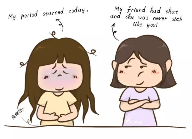 My friend had that and she was never sick like you!(别矫情好嘛我盆友来那个的时候也没见她像你这样啊!)