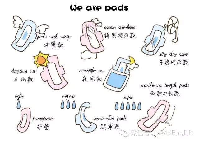先来看看姨妈巾肿么说吧,像上面那种disposable menstrual pads是比较正式的说法,一般我们直接说pads就可以了(是的你没看错,就是ipad里的这个pad),在店里的feminine hygiene(女性卫生用品)那块儿就能找到。