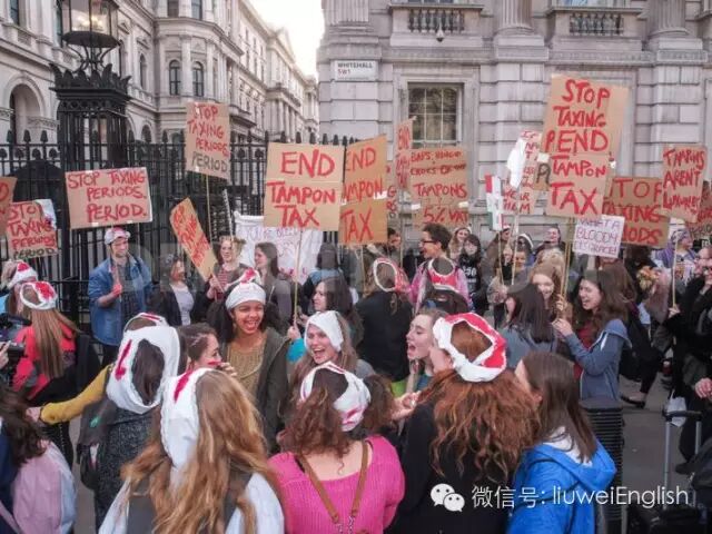 于是。。。这么呵呵哒的政策自然是让广大少女熟女妇女大妈们义愤填膺啊,他们纷纷上街抗议:每盒姨妈条儿(tampons)只有20个都还要3.14胖子,我们每个姑凉要用差不多11000个姨妈条儿才能勉强过好这一生,我得至少工作整整38天才能付掉这笔巨款好吗?(嗯,Vicky帮忙算了下:3.14X(11000/20)=1727胖子)