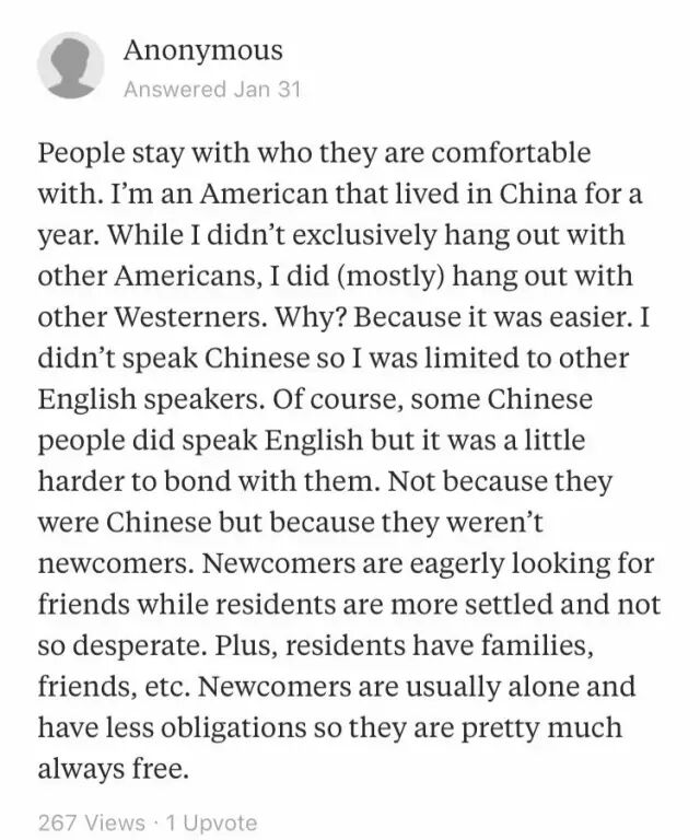 “人们都会跟让自己感到舒服的人在一块儿。我是个美国人,来中国已经一年了。虽然我也不是只和美国人玩儿,但大部分时间都和西方人一起出去玩。为什么呢?因为这样更轻松啊。