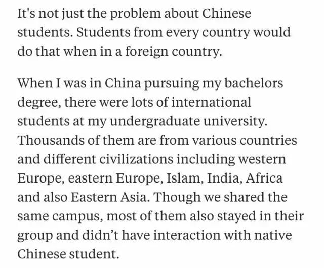 “所以很容易理解为什么中国留学生喜欢扎堆,不仅仅是他们,每个留学生或多或少都会这样。”