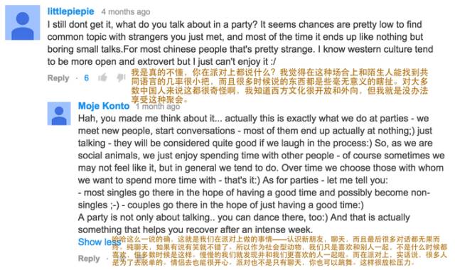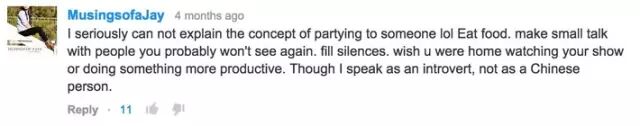 “我也真的不知道怎么解释派对这个概念。吃点东西,和一群你可能不会再见到的人瞎扯,填充尴尬的沉默。你不如在家看看剧或做点有意义的事情。但我只是从一个内向人的角度说而不是从作为中国人的角度出发。”