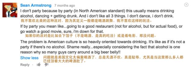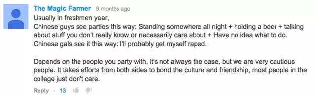 “在大一的时候一般是下面这样的。中国男生认为派对是:我在某个地方站上一晚,拿杯啤酒,扯淡,也不知道在干嘛。中国女生认为派对是:我可能会被强暴。但这一般取决于你和谁玩,不都是这样,比如我们就是很谨慎的一群人。跨文化的友谊是需要时间和努力的,一般大学的年轻人才不在乎。”