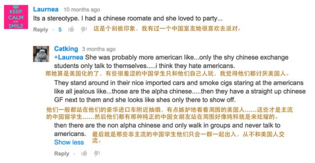 “中国学生能让我笑起来。我和他们一起出去玩过也挺开心的,但大部分的中国学生都太无聊太在乎其他中国人是怎么看待他们的了。这样好傻。我喜欢和我的英籍华人或美籍华人朋友们一起出去玩,他们根本不在乎别的中国人怎么看待他们。”