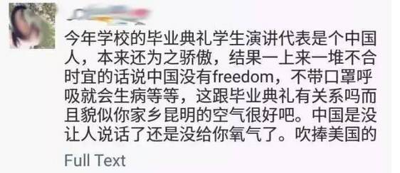这个事情开始在微博有相关讨论了,有点担忧。我看到有一些不理智的评论和谩骂。本来国内的网民们对留学生群体就有一些偏见,希望不要因为这个事情影响到演讲者同学的个人生活。网络暴力不可取。