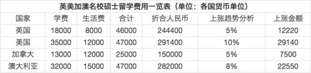 「英美加澳四国名校硕士的平均费用」