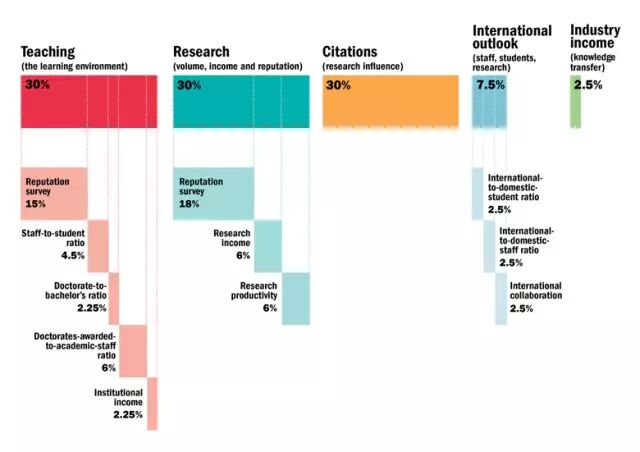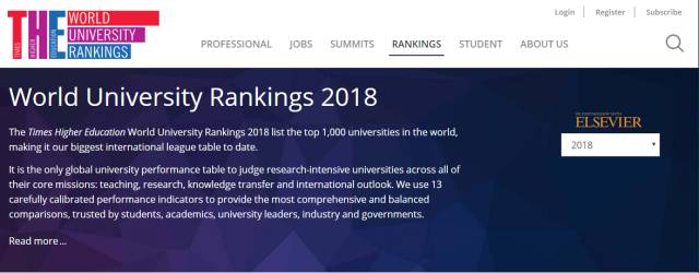 (Times Higher Education,简称THE)是英国发布最早的也是全球影响最大的排名,自2004年11月起,《泰晤士报高等教育》与QS公司合作,每年秋季公布世界大学排名。THE大学排名已经成为了学生了解、选择学校的重要途径和参考。