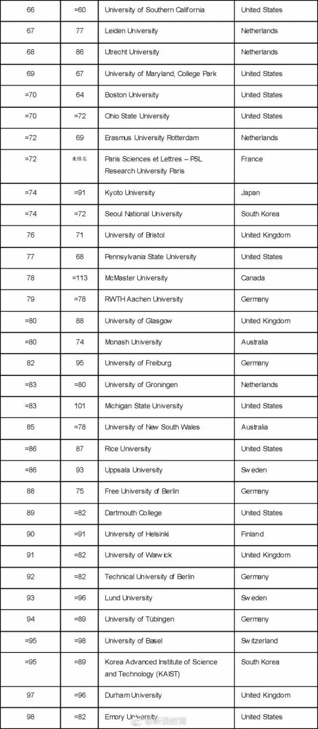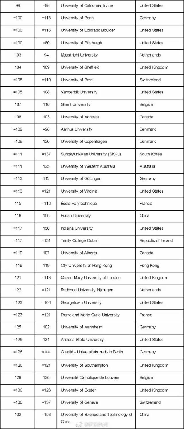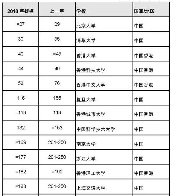 中国有66所大学上榜,其中10所为首次上榜。北京大学为中国排名最高的大学,并列第27名。清华大学排第30名。中国首次有两所大学进入前 30 名,也是其历史上上榜大学最多的一次。以下为中国大学在排名中的位置…