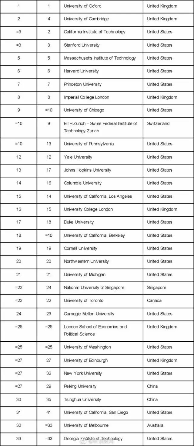 牛津大学依然蝉联第一,剑桥大学排名世界第二,比去年进步两名,主要原因是研究水平不断提高以及研究收入的显著增长。