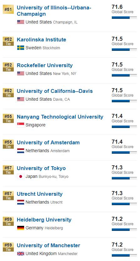 亚洲:排名最高的是新加坡国立大学,排名第43位;
