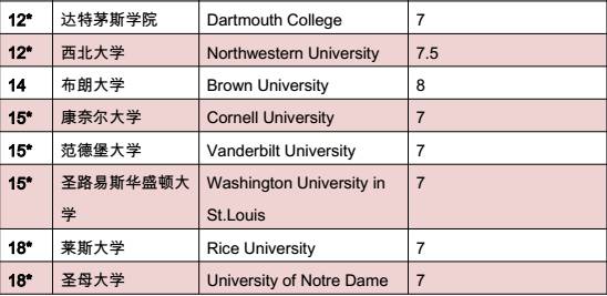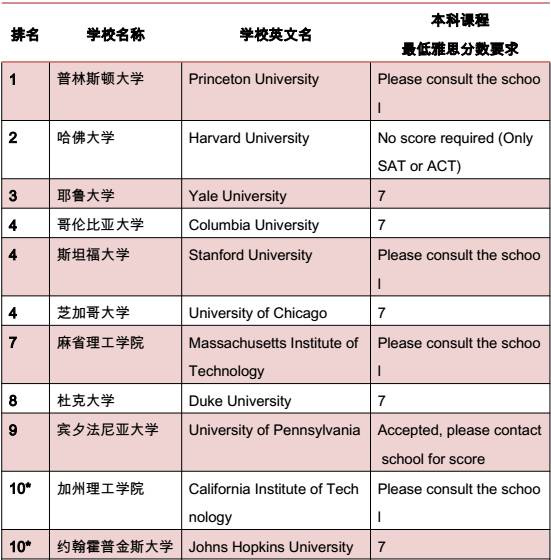 2016年美国综合院校TOP50雅思分数要求