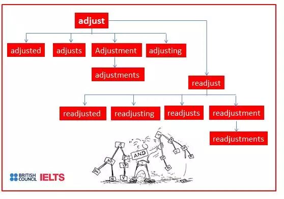 例如,下图中adjust为家长词汇,而它的动词、名词、形容词和副词等形式:adjusted,adjusts,adjustment,adjusting......属于成员词汇。