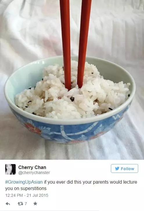 他们的父母常常教育他们不能这样插筷子在米饭上。