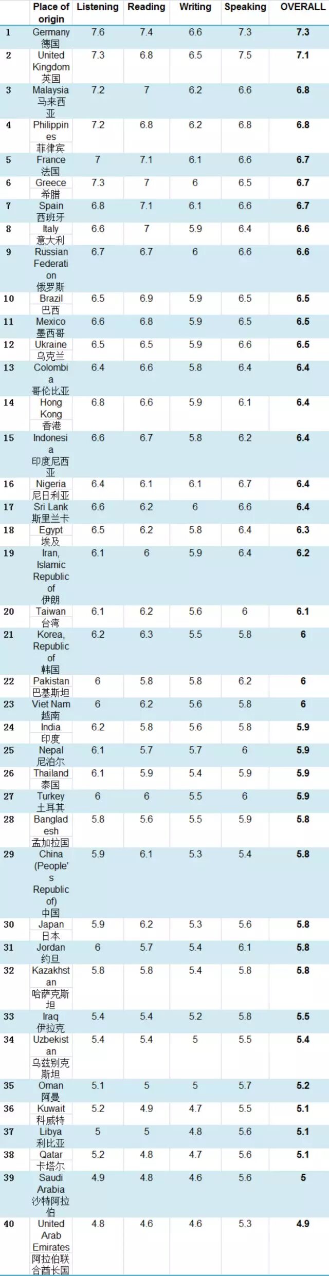 在全球雅思A类考试平均成绩Top 40的排名中,德国再次以总成绩7.3分蝉联第一名;