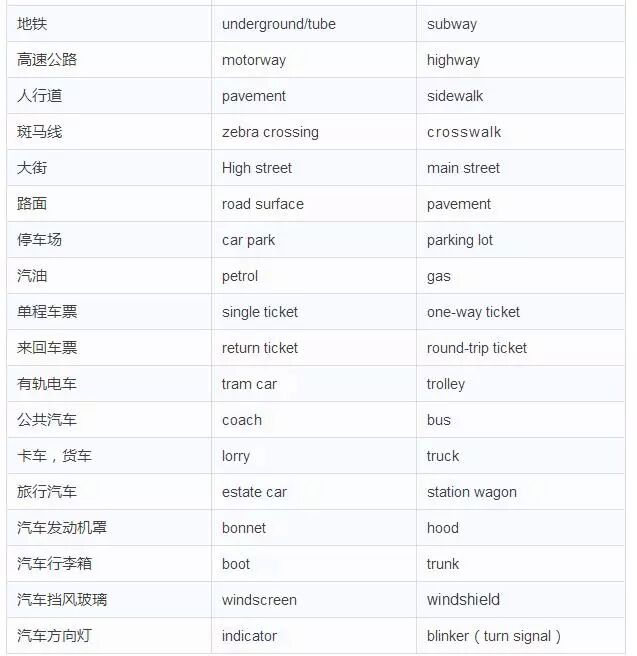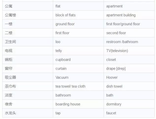 另附: 英式英语VS美式英语「 词汇差异对比表 」
