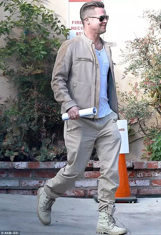 面相成熟一点的童鞋,可以尝试一下像布拉德皮特Brad Pitt这身掀起复古狂潮的粗犷型LOOK,